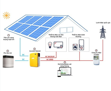 Ưu tiên tự sử dụng, dư điện sẽ hòa lưới bán điện. Hệ thống hoạt động hoàn toàn tự động từ việc sử dụng điện lưới EVN khi bị mất điện sang dùng Ắc-quy dự trữ.