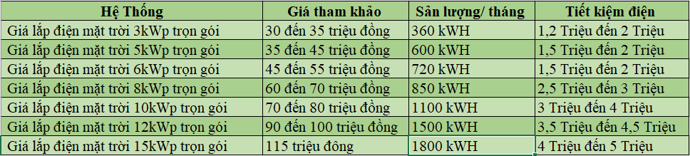 Khi lắp đặt trọn gói bởi Thịnh Cường Solar, một KWP sẽ tạo ra 4-5 ký điện (kWh) trong một ngày, nhưng chi phí lắp đặt chỉ khoảng từ 10-15 triệu. Chi phí lắp đặt của một KWP là khoảng 15 triệu.
