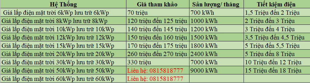 2. Bảng chi phí lắp Hệ thống điện năng lượng mặt trời có lưu trữ (Hybrid)